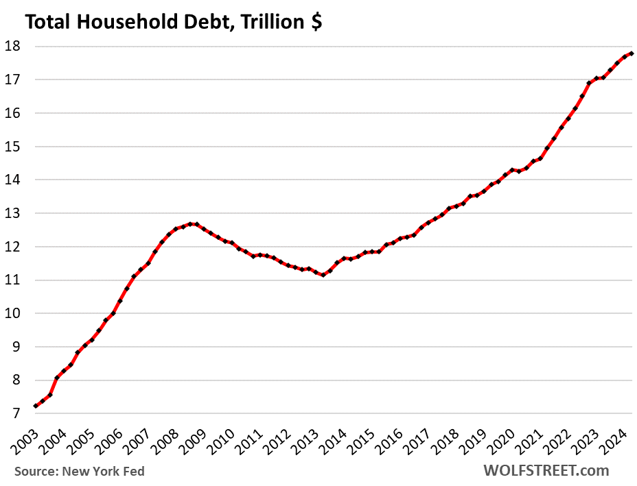 Total household debt outstanding in Q2 ticked up by $109 billion, or by 0.6%, from Q1 – the smallest percentage increase since Q2 2023, and the second smallest increase since Q1 2021 – to $17.8 trillion, according to the Household Debt and Credit Report from the New York Fed today. Year-over-year, total household debt grew by 4.3%.