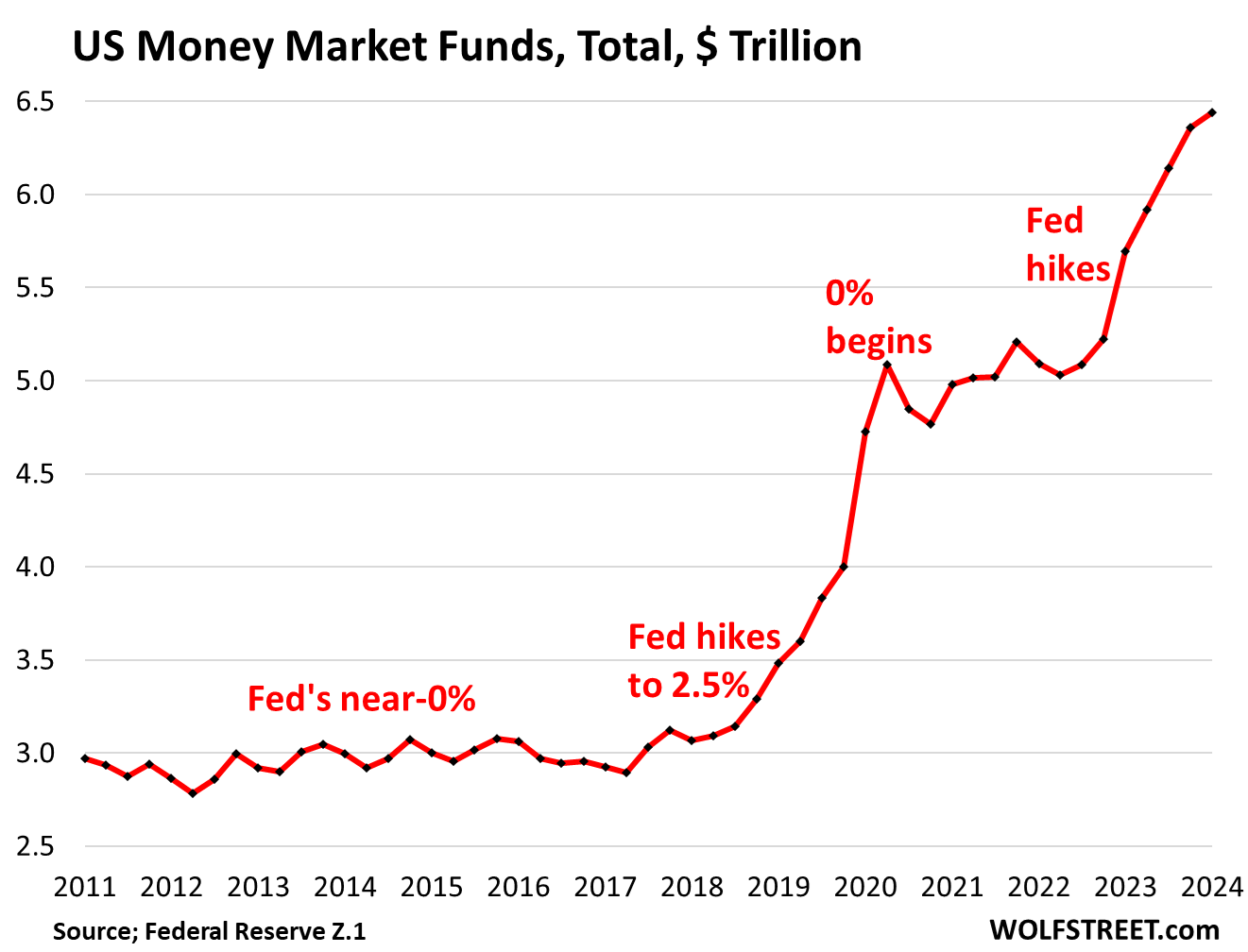Total MMFs held by households and institutions (including for households) spiked to $6.44 trillion by the end of Q1, according to the Fed’s data.