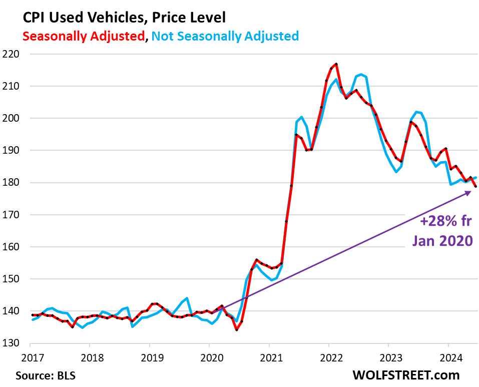 Prices of used cars, SUVs, pickup trucks, and vans that were sold at auctions across the US jumped by 2.8% in July from June, seasonally adjusted, the biggest jump since the surge in early 2023, according to today’s Used Vehicle Value Index by Manheim, the largest auto auction house in the US which runs about 8 million vehicles a year through its auction lanes. The index is adjusted for changes in mix and mileage (red in the chart).