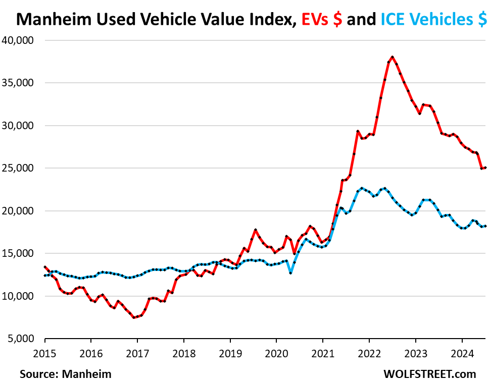 So used EV prices have been coming down off their crazy spike but remain far higher than used ICE vehicle prices and have a lot further to fall to get back into line (prices not seasonally adjusted, red = EVs, blue = ICE vehicles, data via Manheim):