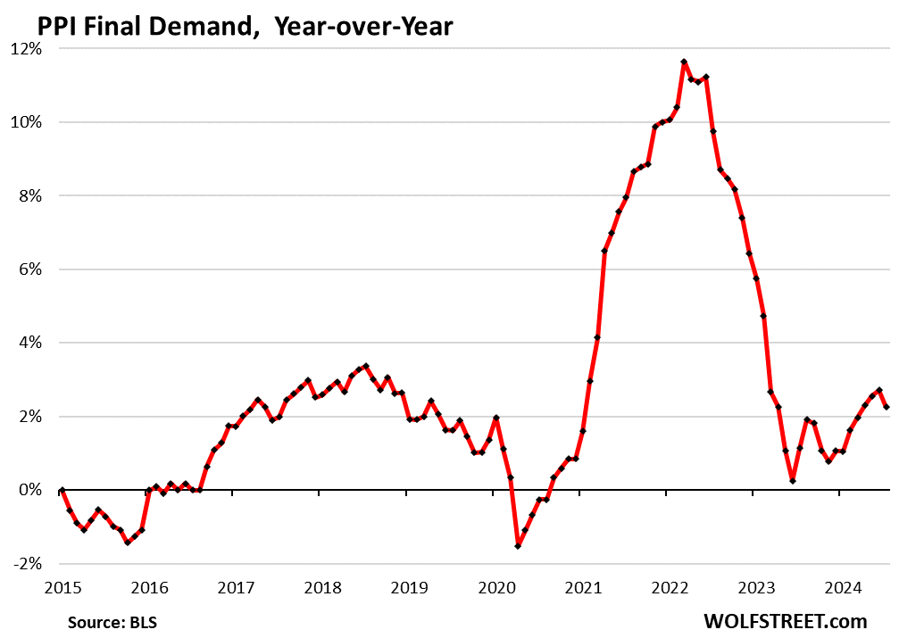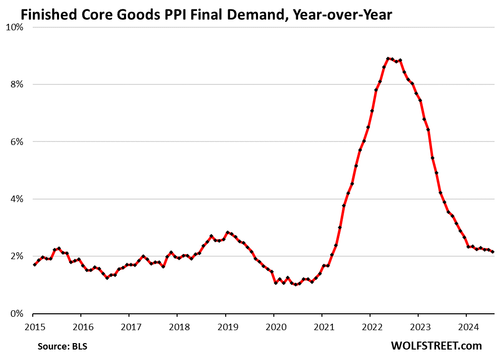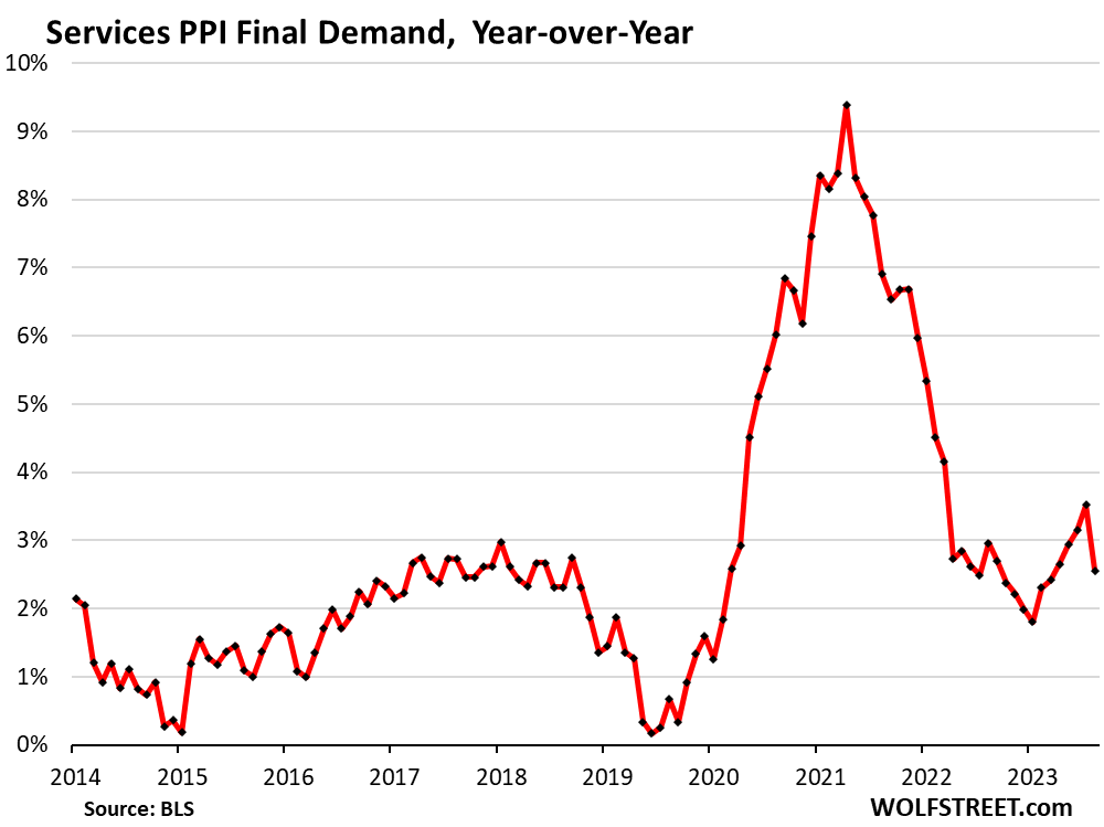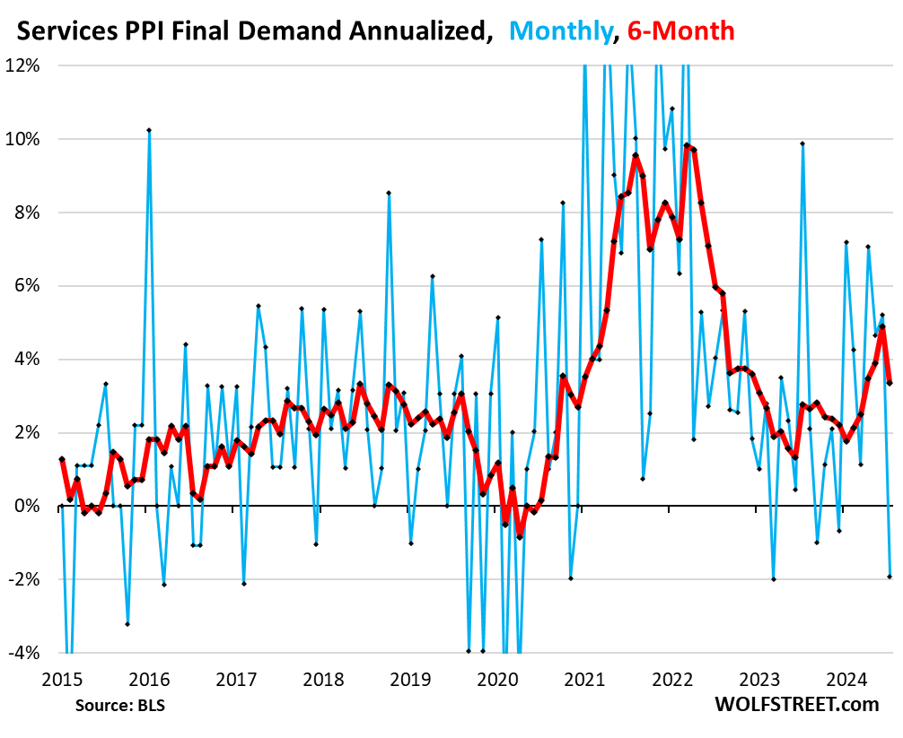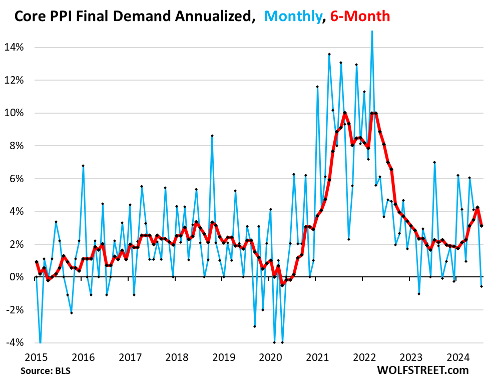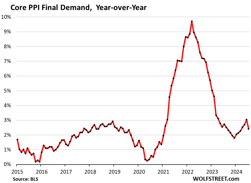 The sharp deceleration on a year-over-year basis of the core Producer Price Index and the services PPI in July was a one-time shot, caused by the services PPI of July 2023 (+9.9%), the highest month-to-month reading in over two years, to fall out of the 12-month figure and be replaced by July 2024 (-1.9%), lowest month-to-month reading since March 2023.