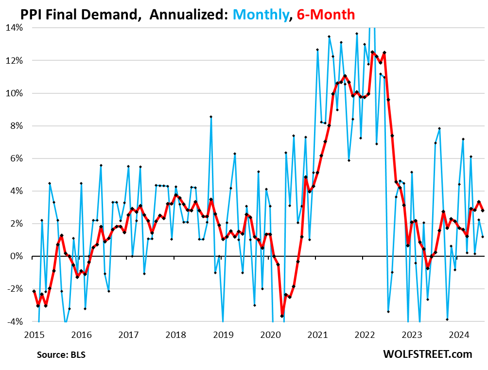 The overall PPI for final demand rose by 1.2% annualized in July from June, a deceleration from June (2.2%). The 6-month rate rose by 2.8% annualized, a deceleration from the 3.3% in June, which had been the highest since October 2022.