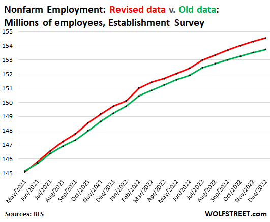 BTW, here are the prior two “revised v. old data” charts, based on the final benchmark revisions after they’re integrated into the jobs data in February: