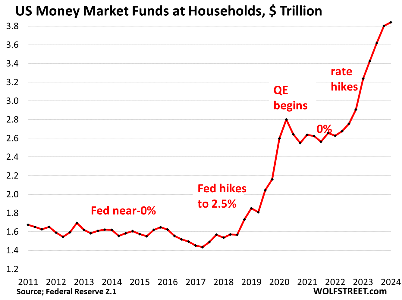 Here are household money market funds and CDs, on top of checkable deposits. That doesn’t include T-bills. The decline in CD balances occurred when interest rates were near 0% and people put their cash into stocks and left the remainder in their checking accounts, because it didn’t make much difference at the time. When interest rates rose, balances rose: