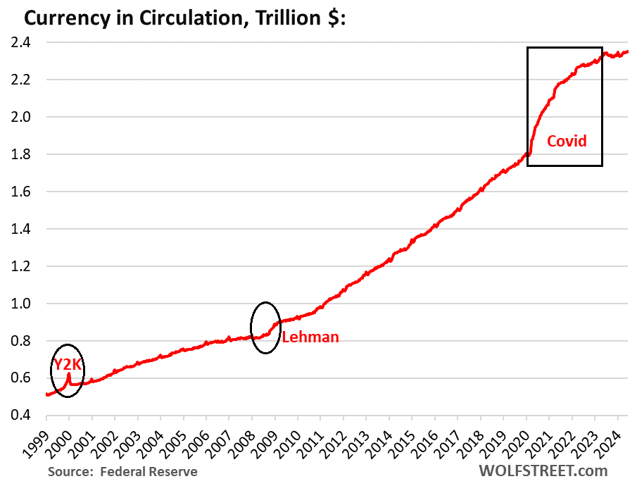 And no, the Fed’s balance sheet cannot go back to “2008” to $800 billion. The Fed’s balance sheet has always risen at least in parallel with “currency in circulation,” the “Federal Reserve Notes,” or paper dollars, that the Fed issues to the banks in exchange for collateral, such as Treasury securities. Currency is demand-driven; the banks must have enough on hand to meet demand; and much of it stashed somewhere overseas.
