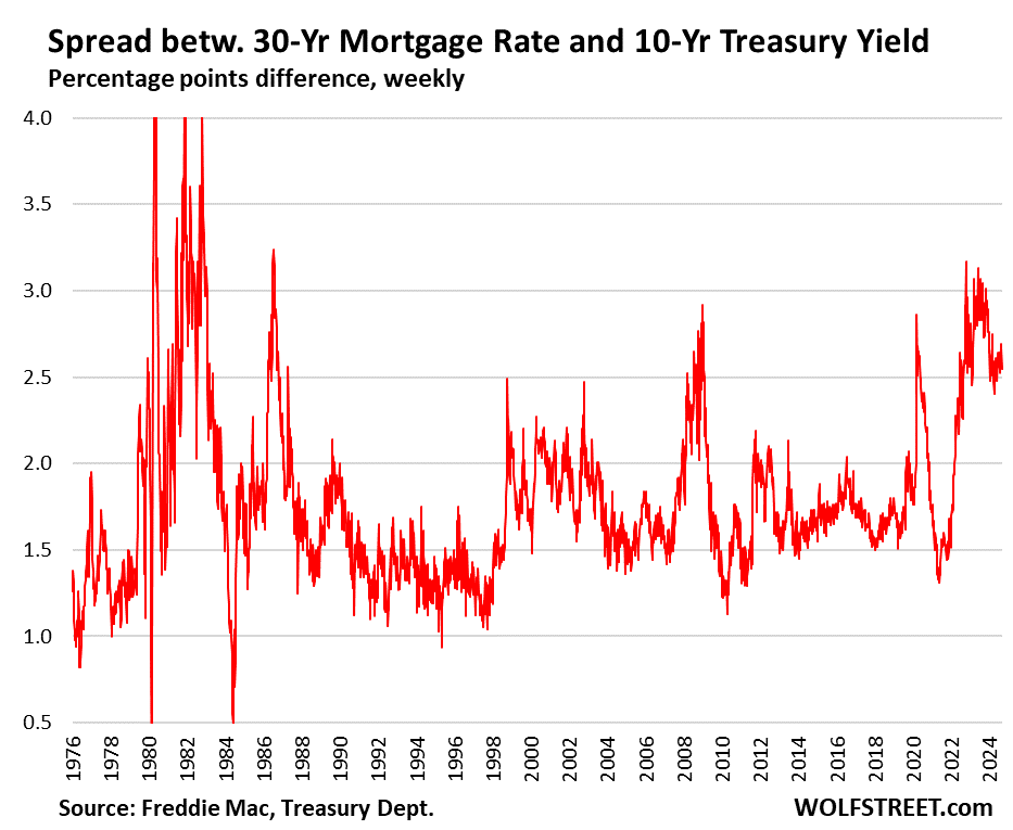 When the Fed reduces its portfolio of MBS while overall issuance of MBS continues, it means that the market must pick up all the new issues. The Fed was a huge player in the MBS market, so with it pulling out, it would put upward pressure on the spread between mortgage rates and the 10-year yield. And the spread widened a lot since QT started: