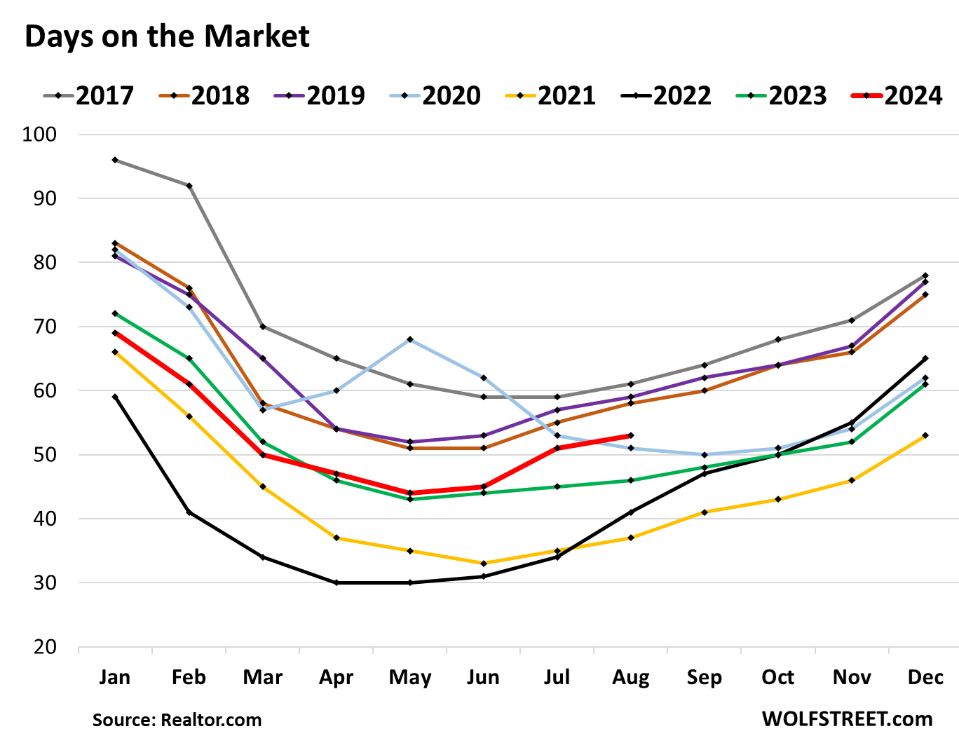Days on the market is kept down by sellers pulling their home off the market when it doesn’t sell after a few weeks, to then relist it later for sale at a lower price, or to try to rent it out, or turn it into a vacation rental, only to then relist it for sale. The metric tracks the mix of how quickly homes sell, and how aggressively sellers pull their unsold homes off the market.