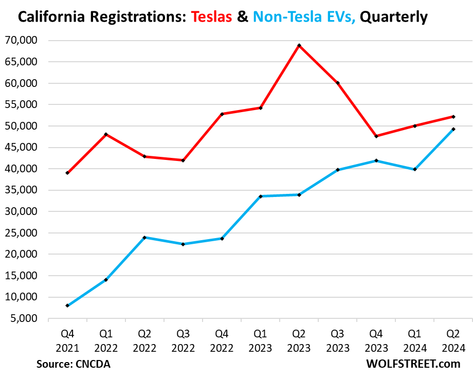 But that has changed in 2024. The F-150 (both ICE and EV models combined) dropped to #3, actually to #4 in Q1 and picked up some share to end up in the #3 spot for the first half, with a share of 2.7%, behind the Toyota RAV4 (2.8%) and the Tesla Model Y (2.8%), based on registrations, reported by Experian yesterday.