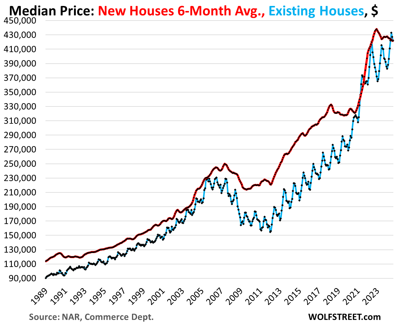 The six-month-average median price of new houses (red in the chart below) dropped to $421,533 while existing-house prices dropped $422,100 in August (blue):