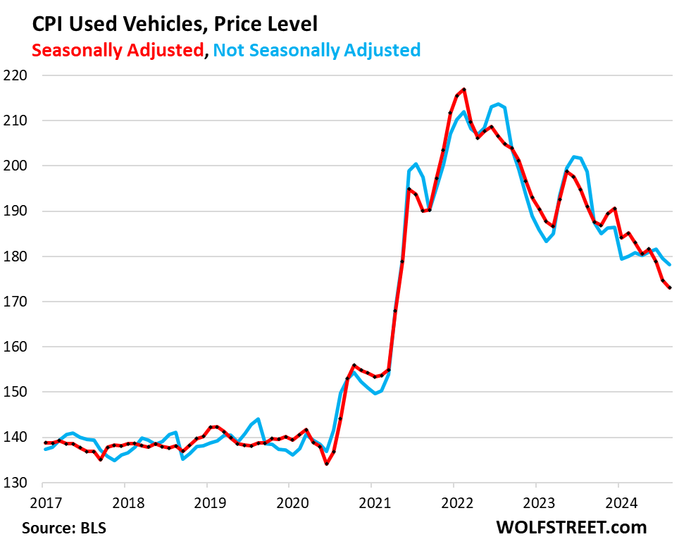 I also publish-price level indices, in addition to rate-of-change indices, but not for the PCE data (because it’s kind of irrelevant because the only reason we look at PCE is because the Fed uses it). I publish them for the CPI data, which is the main index we have. you can get the price-level-indices here, including by detailed category, such as “used vehicle CPI”: