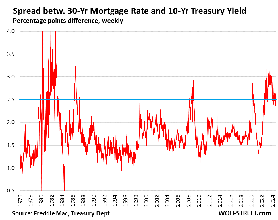 With the 10-year yield 3.98% on Friday, and the average 30-year fixed mortgage rate at 6.53%, the spread between the two measures was 2.55 percentage points.
