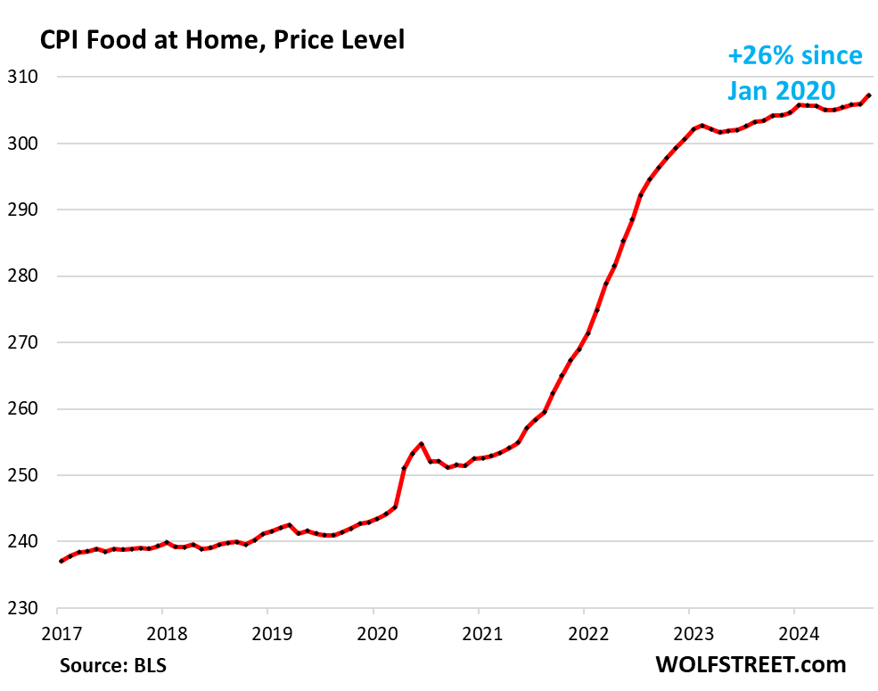 Inflation of “Food at home” – food purchased at stores and markets and eaten off premises – flattened out this year at a very high plateau, but in September rose again. The CPI for food at home is up by 26% since January 2020.