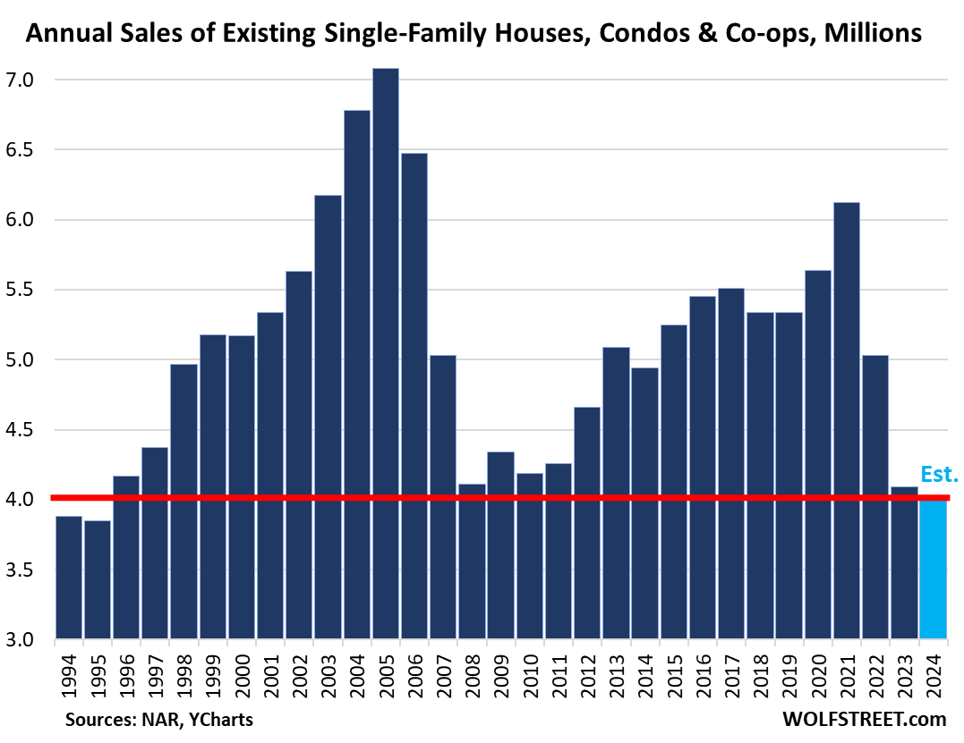 Mortgage rates fell from nearly 8% in late October 2023 to 6.1% in early September 2024, and all it accomplished is that SELLERS came out to sell, and inventory and supply shot up, but buyers remained on buyers’ strike, and sales remained at the slowest pace since 1995. And that’s how it should be. This is a price issue and not a rate issue — prices shot up by 50%-plus in many markets in a three-year span! These high prices have caused demand destruction worse than during the housing bust. The solution is lower prices. Demand will re-emerge at substantially lower prices. This is a fundamental economy dynamic that applies to just about everything, from commodities to cars.