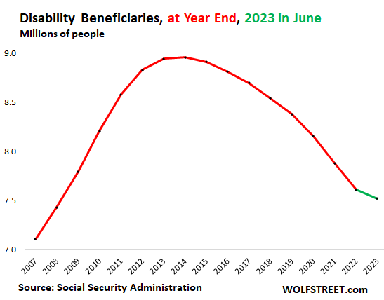 - Benefit payments: +$102 billion (+8.5%), to $1.29 trillion; more retirees drawing benefits; and COLAs of 8.7% for October, November, and December 2023, and 3.2% this year.