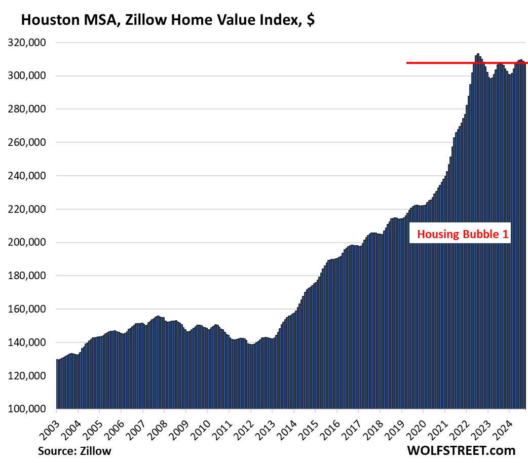 Houston metro: +0.4% year-over-year, -1.9% from the July 2022 peak