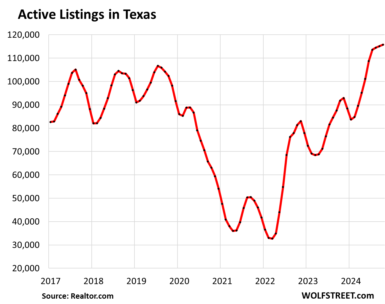 The housing market in Texas just hit another multi-year record of sorts: Active listings reached a new high in October in the data of Realtor.com going back to 2016. New listings are showing up at about the normal rate for this time of the year, but sales are lethargic despite dropping asking prices – prices clearly haven’t dropped enough – and so the inventory keeps piling up and going stale.