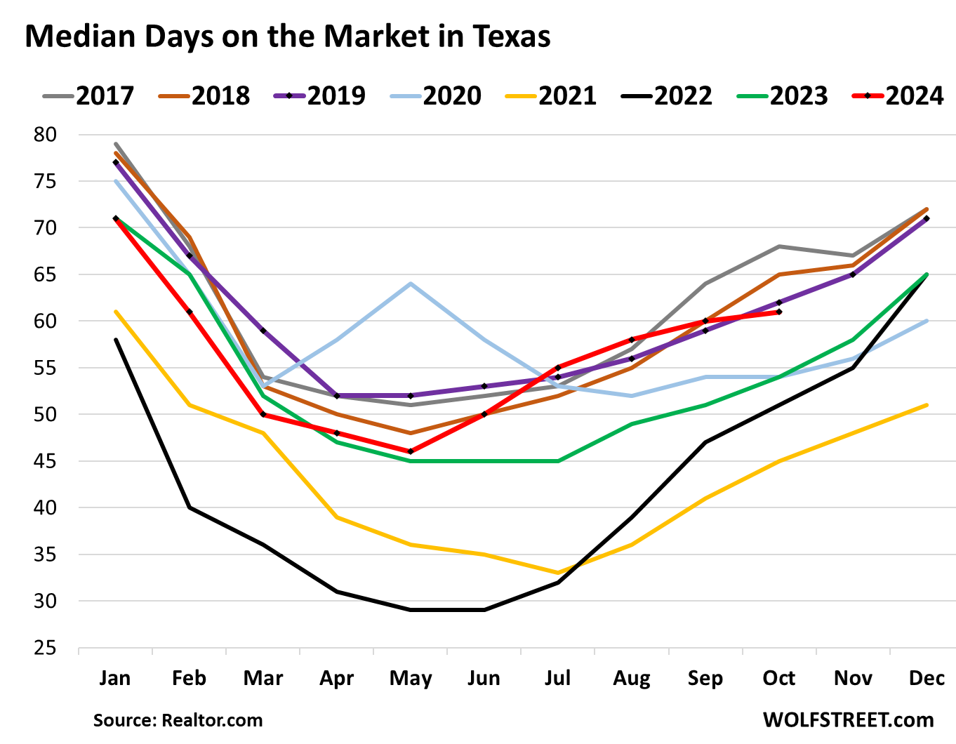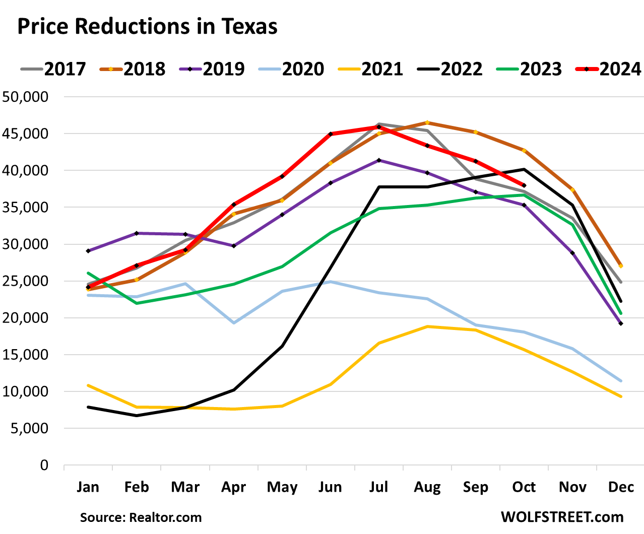 In October, there were 37,984 listings with price reductions in Texas, the third highest for any October in the data by Realtor.com going back to 2016. Only the Octobers in 2022 and 2018 were higher. Obviously, as we can see from the inventory pile-up, these price reductions are not doing the job.