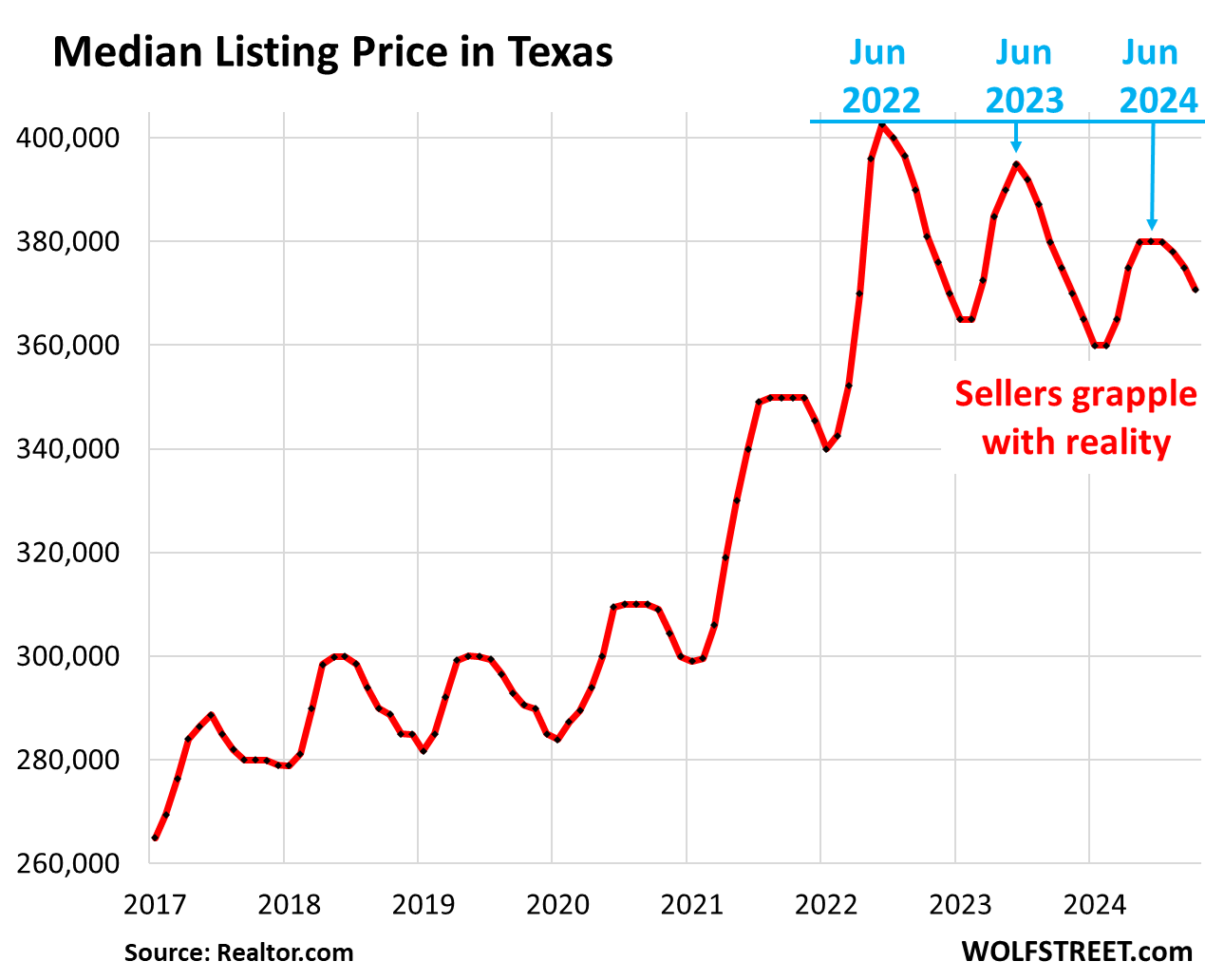 Listing prices are prices that sellers imagine. They’re not transaction prices. Transaction prices are set by buyers. In the major metros in Texas, transaction prices have fallen to varying degrees. More in a moment.