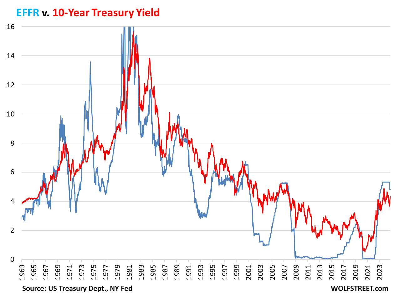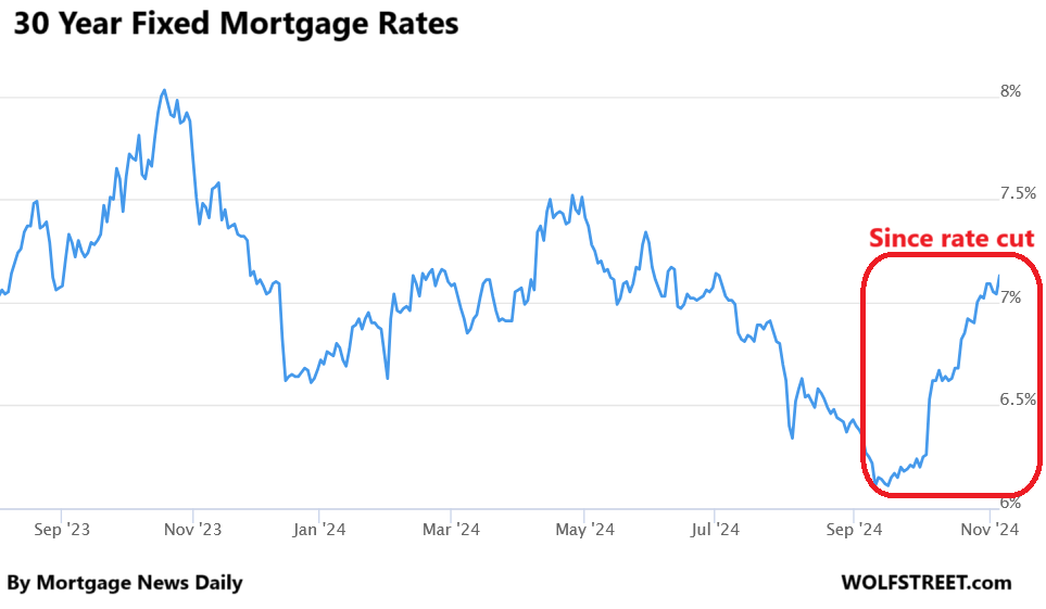 But mortgage rates had already plunged from nearly 8% in November last year to 6.1% by mid-September this year, without any rate cuts, on just a wing and a prayer, thereby pricing in all kinds rate cuts and whatnot. And since the rate cut, much of the wing-and-a-prayer plunge in longer-term yields has reversed, that’s all that has really happened.