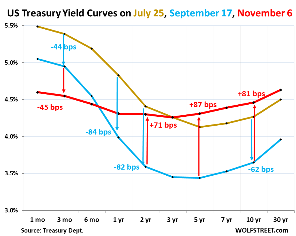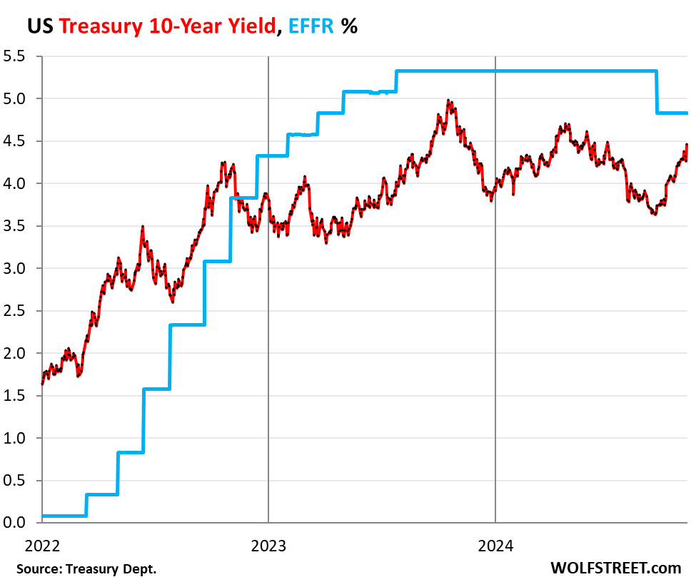 Note by how far those longer-term yields have risen since the September rate cut (blue line). The yields from 3-years through 10-years have shot up by over 80 basis points since the September rate cut, a screeching-tire U-turn, going down in two months, going back up faster and further in seven weeks, amid huge volatility in the Treasury market.