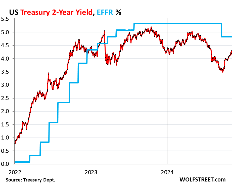 The 2-year Treasury yield shot up by 10 basis points this morning, to 4.29%, the highest since July 31. Since the rate cut, it has shot up by 69 basis points.