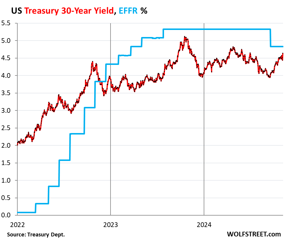 The 30-year Treasury yield spiked by 20 basis points this morning, to 4.64%, the highest since May 31  May 30. Since the Fed’s rate cut on September 18, it has shot up by 68 basis points.