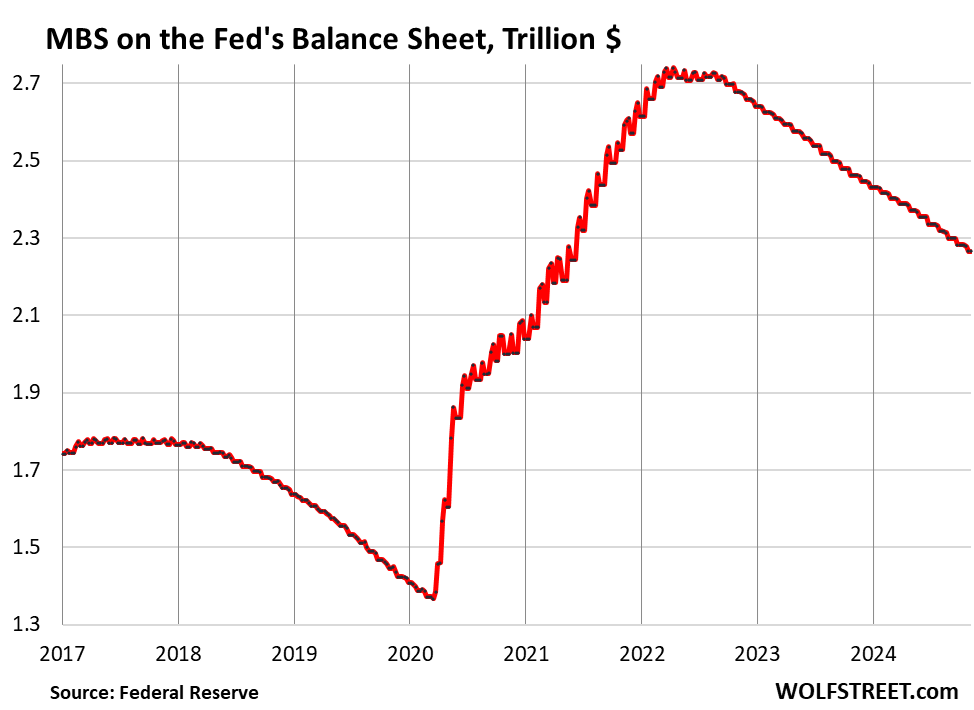 Treasury notes (2- to 10-year) and Treasury bonds (20- & 30-year) “roll off” the balance sheet mid-month and at the end of the month when they mature and the Fed gets paid face value. The roll-off is now capped at $25 billion per month. About that much rolled off in September, minus the amount of inflation protection the Fed earns on its Treasury Inflation Protected Securities (TIPS) that was added to the principal of the TIPS.