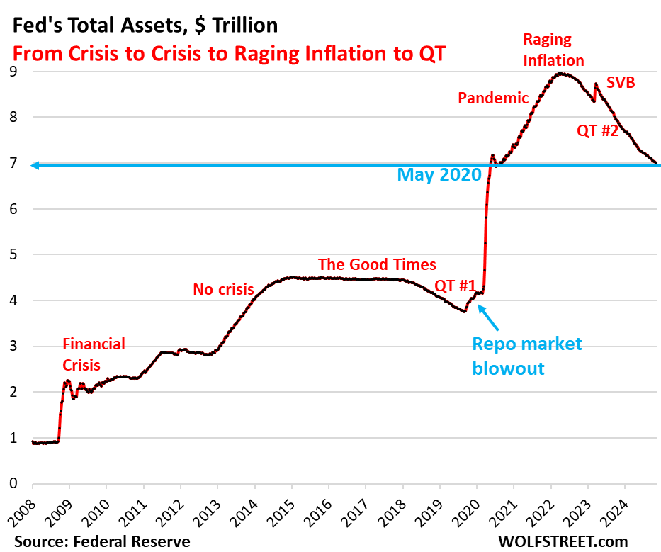 Another milestone in the Fed’s QT program: Total assets on the Fed’s balance sheet dropped to $6.99 trillion, according to the Fed’s weekly balance sheet today. The balance sheet first reached this level in May, 2020, after nearly three months of mega QE (blue arrow in the chart).