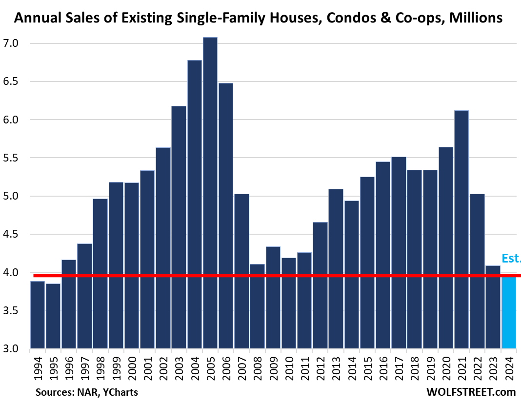 And this growing preference for renting instead of buying will sap demand for home purchases even more, with sales having already plunged to levels not seen since 1995. Too-high prices destroy demand, which is a fundamental economic principle that even home sellers cannot escape (light-blue column = our estimate for 2024, historical data from YCharts).