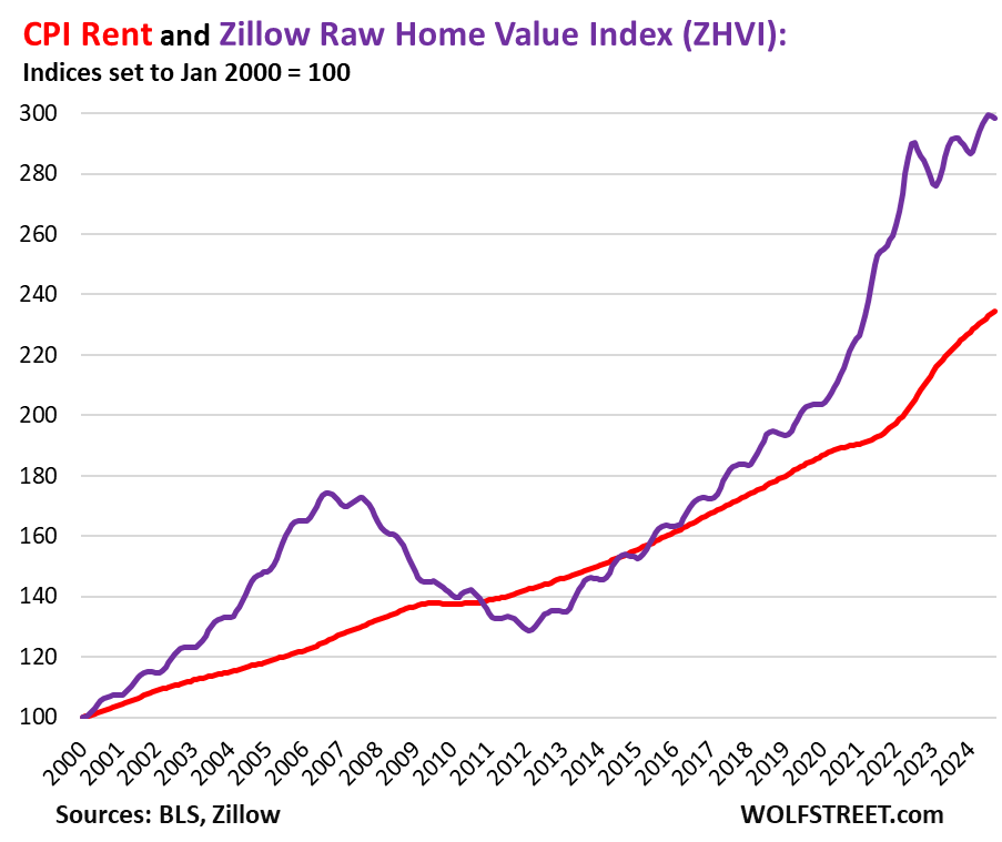 Simply comparing the trajectories of rents and home prices – excluding the effects of higher mortgage rates, soaring property taxes, and spiking homeowners’ insurance premiums – shows just how far home prices have gone out of whack.
