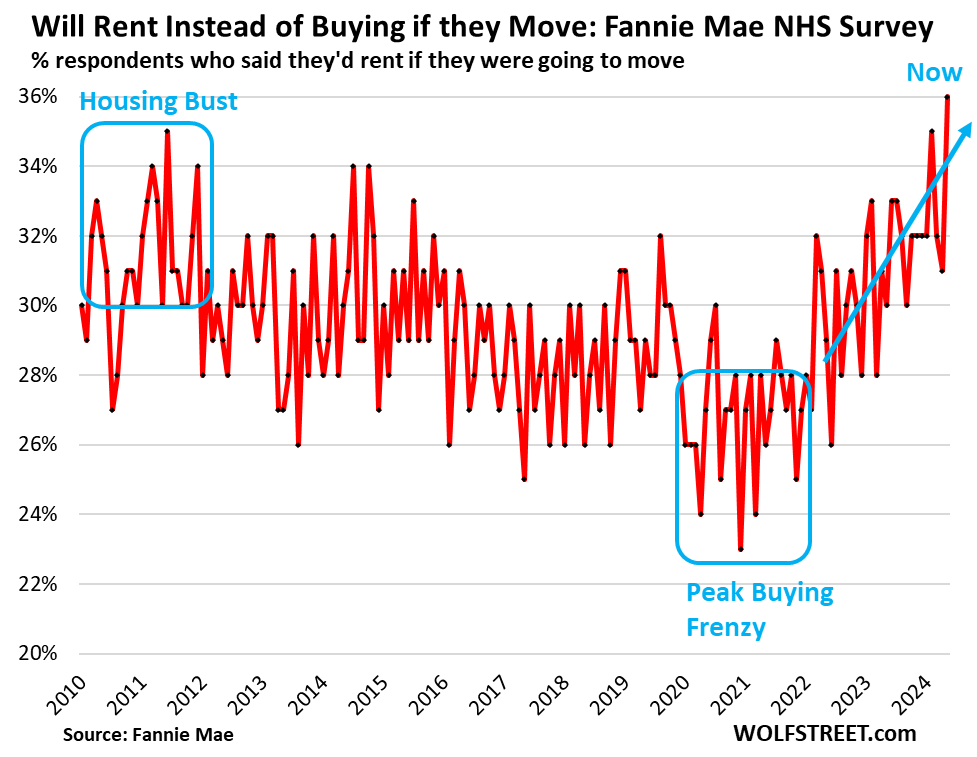 The share of people who said that they would rent rather than buy a home if they were to move spiked to 36%, an all-time high in the data going back to 2010, according to Fannie Mae’s National Housing Survey, up from the 23% to 28% range during the free-money buying frenzy in 2021-2022.