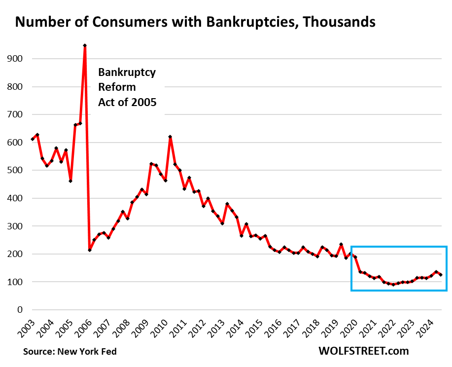 The number of consumers with bankruptcy filings dipped to 126,140 in Q3, lower than any time before the free-money era. In Q2, there were 136,180 consumers with bankruptcy filings. In 2017-2019, during the Good Times before the pandemic, the number of consumers with bankruptcy filings ranged from 186,000 to 234,000, which had been historically low.