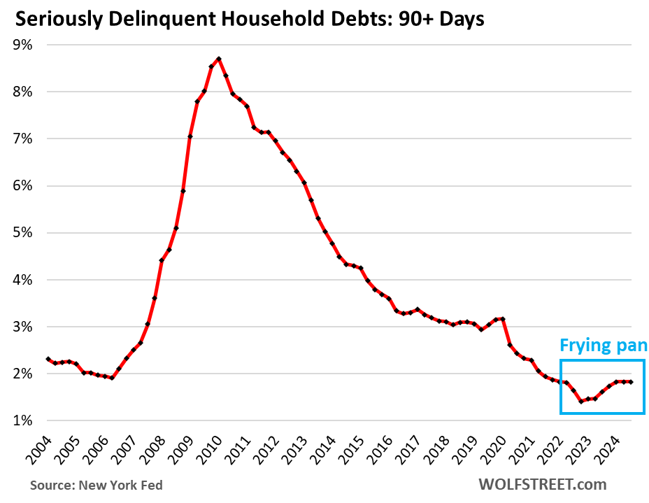 Household debts that were 90 days or more delinquent by the end of Q3 remained unchanged for the third month in a row, at a historically low 1.8% of total balances outstanding, lower than any time before the free-money-era of the pandemic.