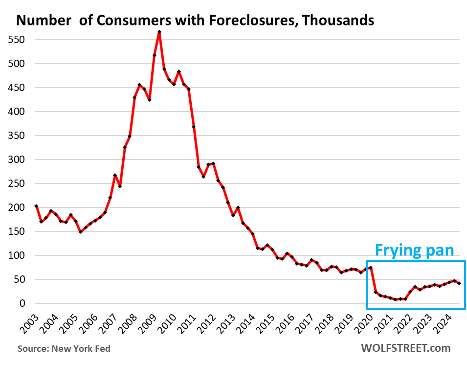 The mortgage forbearance programs and foreclosure bans during the pandemic reduced the number of consumers with foreclosures to near zero. They have risen since then but remain well below the prior all-time lows, and in Q3 dipped further, to 41,520 consumers with foreclosures, down from 47,180 in Q2. In the Good Times right before the pandemic (2017-2019), there were between 65,000 to 90,000 consumers with foreclosures.