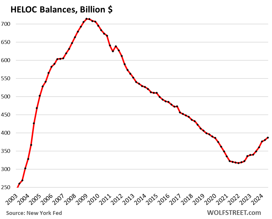 Balances of Home Equity Lines of Credit jumped by 1.8% in Q3 from Q2, and by 11.9% year-over-year, to $387 billion. Since the low point in Q1 2022, HELOC balances have surged by 22%.