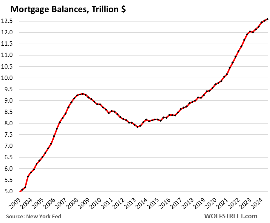 Year-over-year, mortgage balances rose 3.8%, according to the Household Debt and Credit Report from the New York Fed, based on Equifax credit reports. The increases over the years were driven by higher prices and thereby larger amounts financed, and peaked at 10% year-over-year during the frenzied Q1 2022 and were above 9% for the rest of 2022. But under the new regime of much higher mortgage rates and too-high prices that have either stalled or are falling, the increases in mortgage balances have slowed dramatically since the end of 2022.