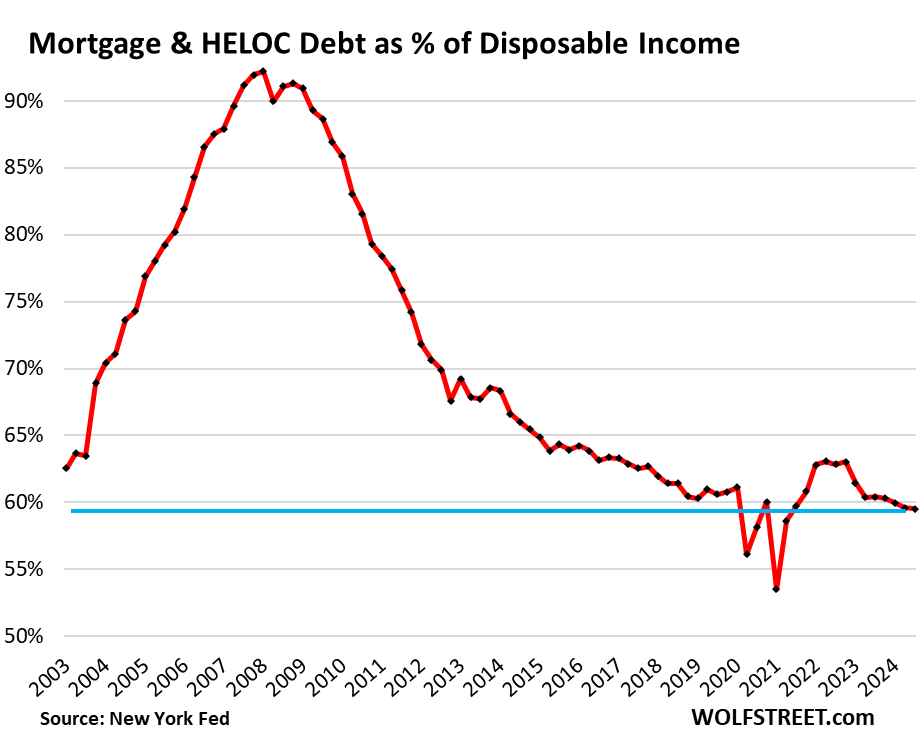 Quarter-to-quarter, disposable income rose faster (+0.77%) than mortgage and HELOC balances (+0.60%), and so the debt-to-income ratio edged down to 59.5%, the lowest in the data except for the few quarters during the free-money-stimulus era when disposable income was grotesquely inflated.
