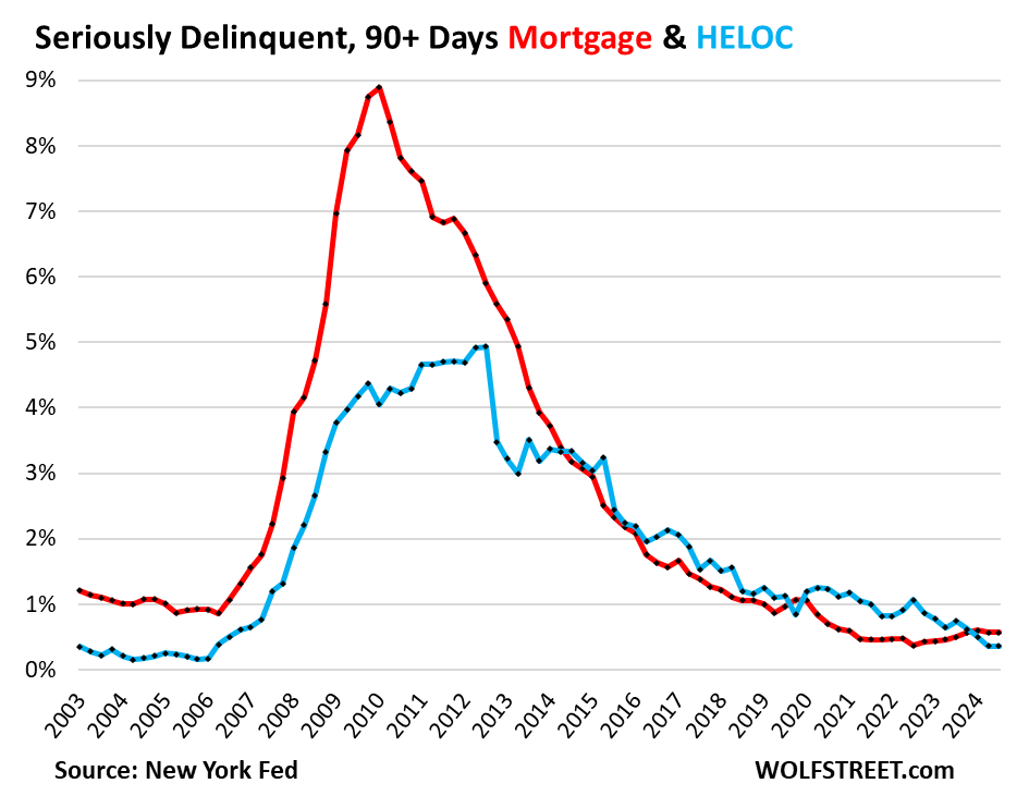 Mortgage balances that were 90 days or more delinquent remained at 0.57%, well below the range during the Good Times right before the pandemic and before the Financial Crisis, both of around 1% (red line in the chart below).