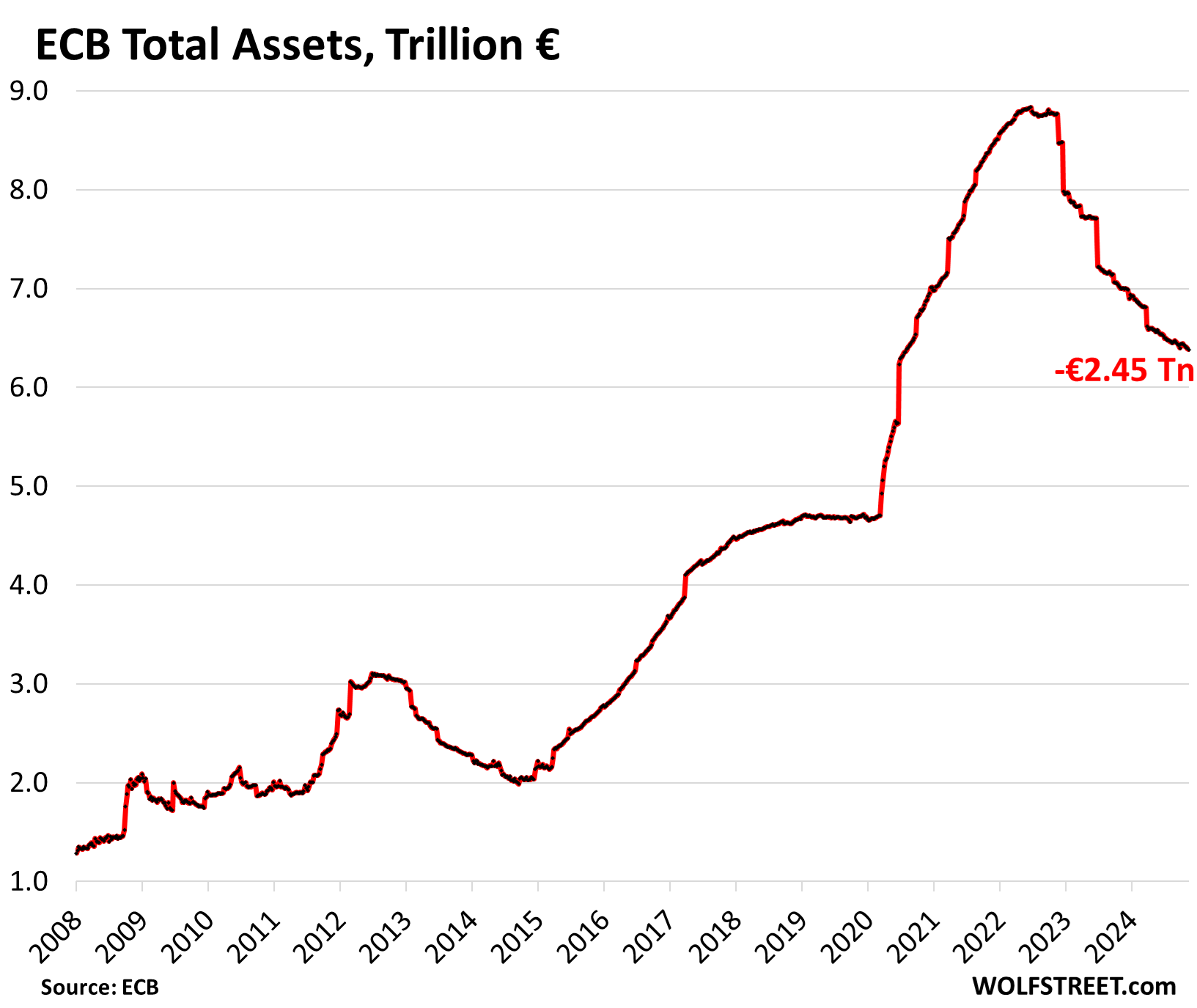 The ECB did QE in two big ways: huge loans to banks and bond purchases. When it decided to start QT, it made the terms of the loans less attractive by raising the interest rates, and then banks paid off those loans on their own, and all those loans plus earlier ones have been paid back. That was the easy part of QT, and it amounted to €2.1 trillion. And that was a lot of bank liquidity to suck out of the system.