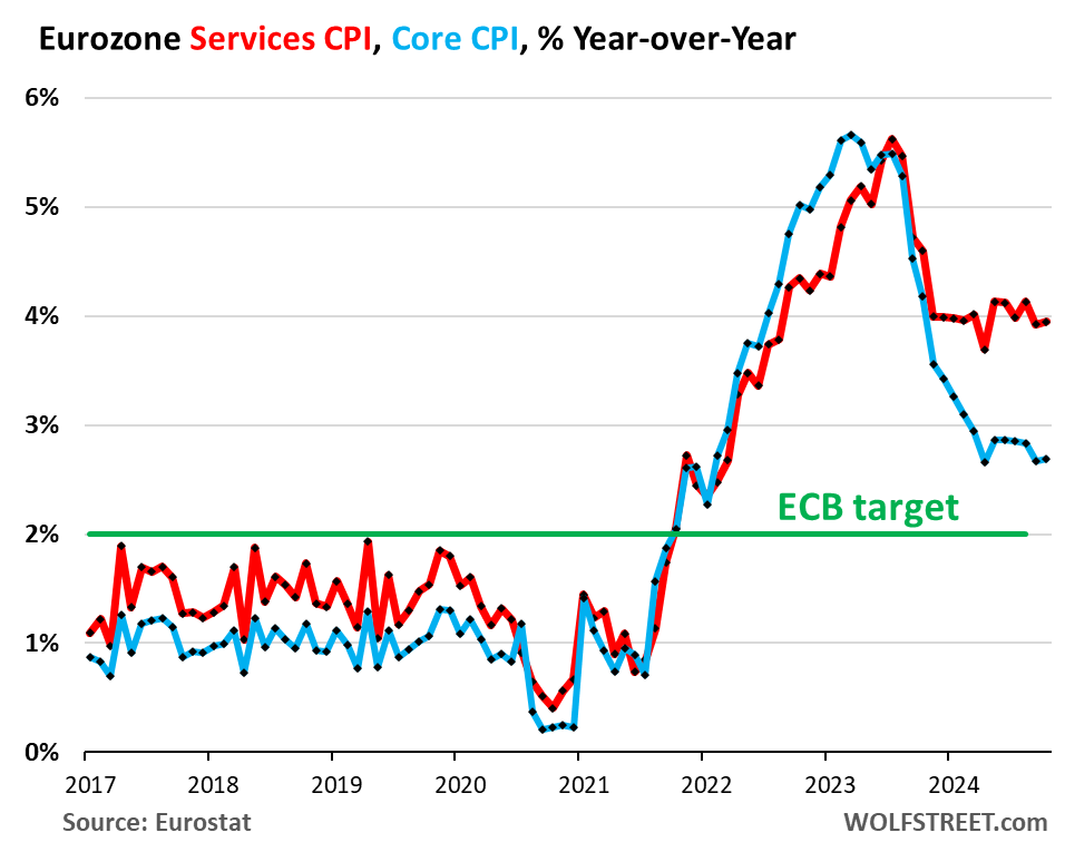 And services inflation has remained stubbornly hot in the Euro Area, despite the massive plunge in energy prices, and declines in prices of many goods. The services CPI accelerated to 4.0% year-over-year in October, after a deceleration in September, according to Eurostat earlier this month. It has been stubbornly rising at about 4.0% year-over-year since November 2023 (red in the chart below).