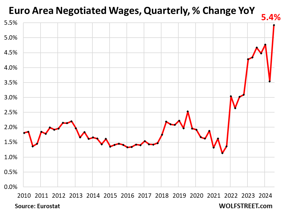 And it blew a fuse today. In Q3, “negotiated wages” spiked by 5.4% year-over-year, according to the ECB today, after the false-hope deceleration in Q2.