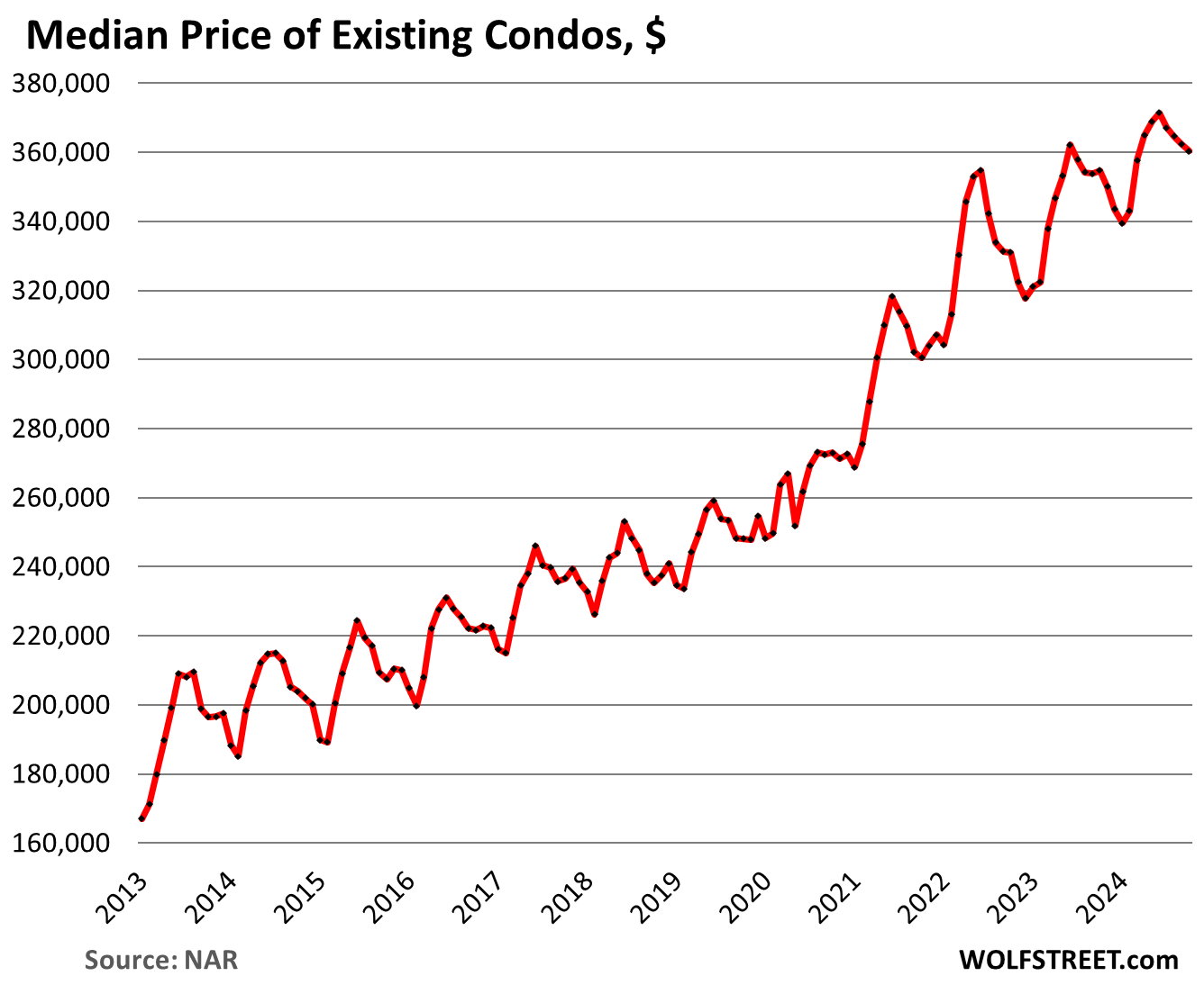 The median price of condos and co-ops dipped by $2,200 to $360,300 in October, which whittled down the year-over-year gain to 1.6%, the smallest gain since May 2023. Unlike single-family house prices, condo prices didn’t book any year-over-year declines in mid-2023, but very small rises.