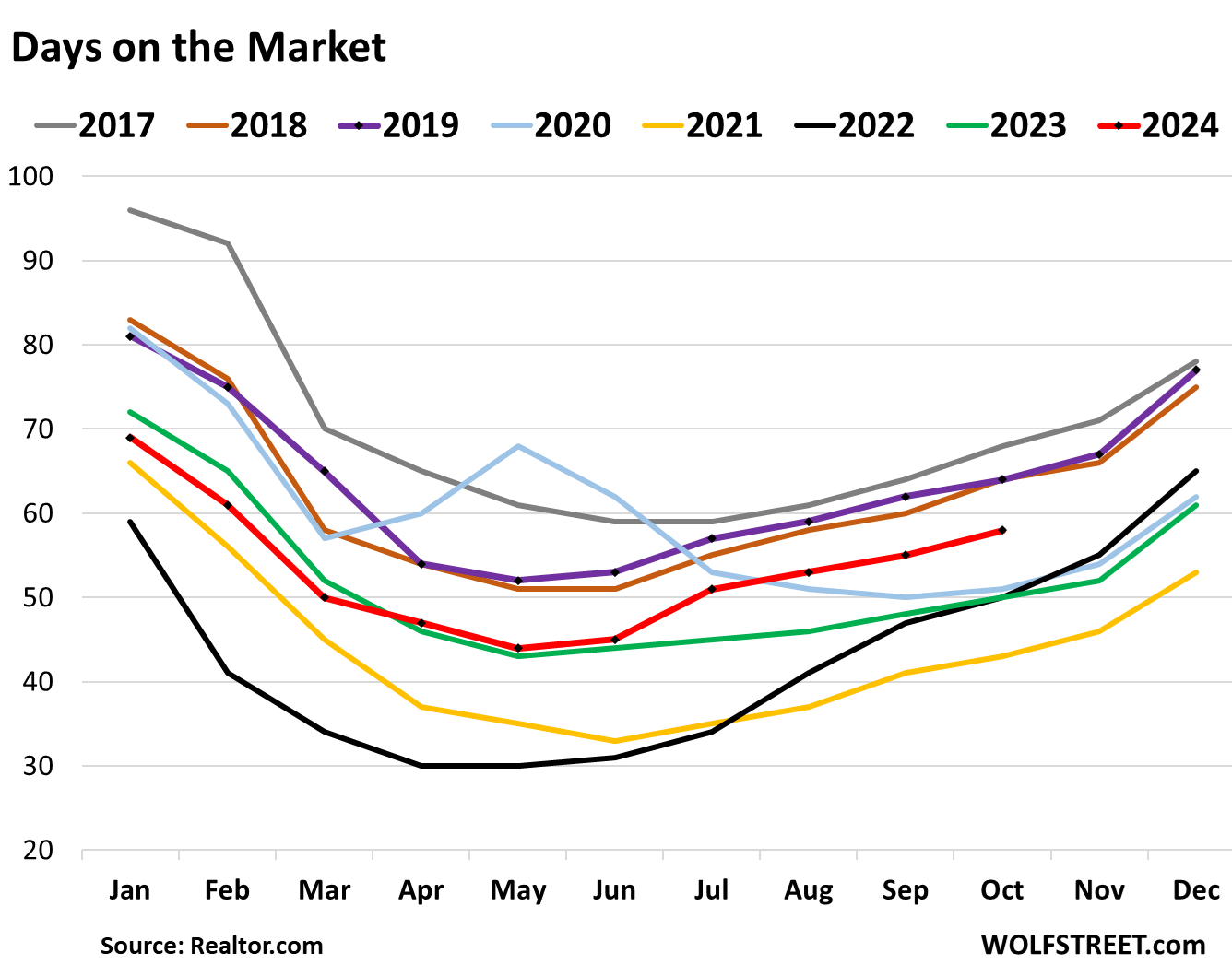 The median number of days before the home is either sold or pulled off the market because it failed to sell rose to 58 days in October, the most for any October since 2019, and up from 50 days a year ago, according to data from Realtor.com. This is in part a measure of how motivated or unmotivated sellers are.