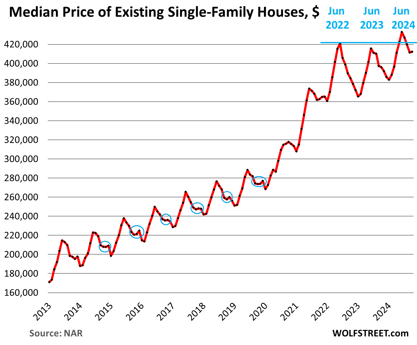 The median price of existing homes reported by the National Association of Realtors exploded by nearly 50% from early 2020 through mid-2022, fueled by the Fed’s interest rate repression and many trillions of dollars of free money. It was the craziest 2.5-year frenzy ever in the US housing market, as a result of which prices are way too high, and those now way-too-high prices have destroyed demand, and buyers are on strike.