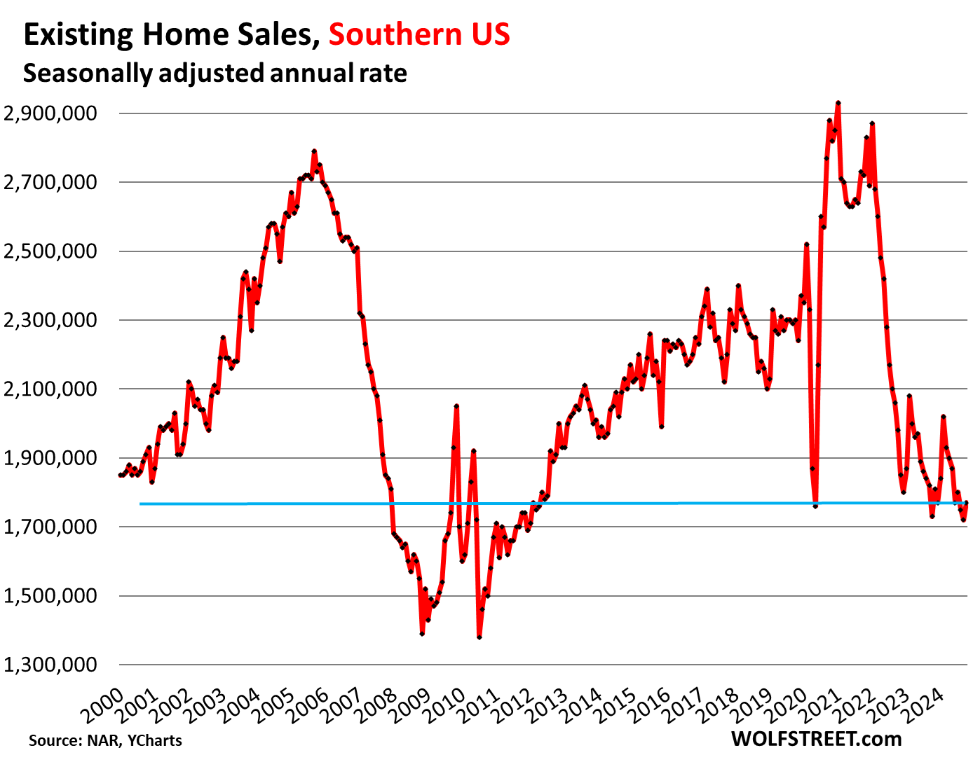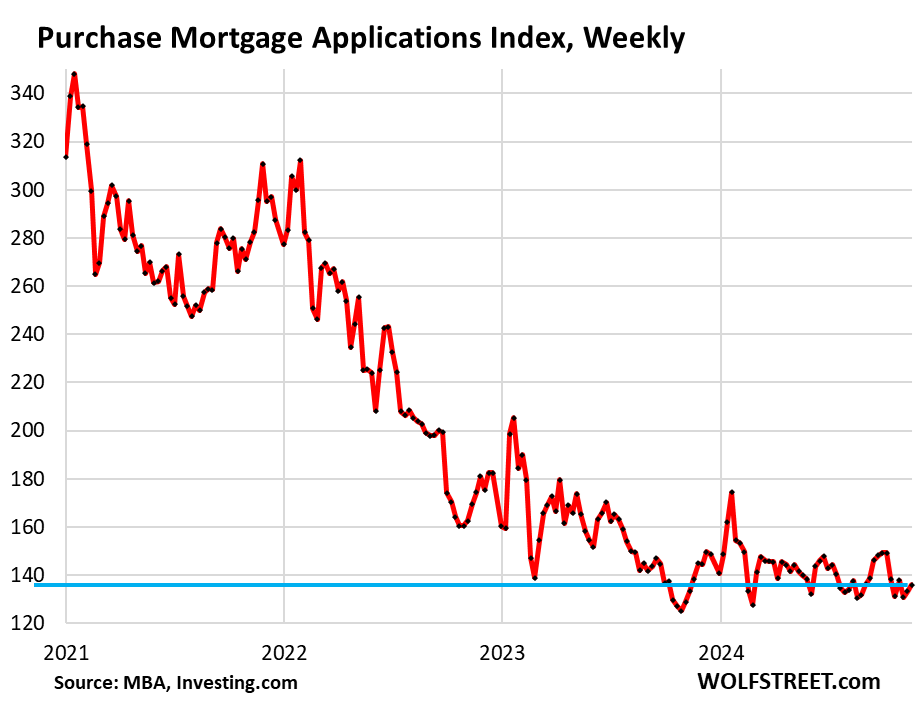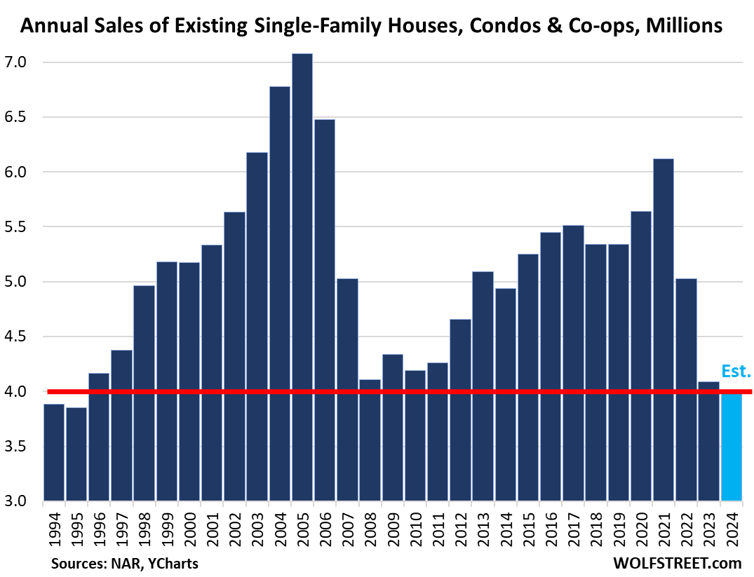 With today’s sales figures, the WOLF STREET estimate for whole-year sales in 2024 comes in at 4.02 million sales, the lowest since 1995, below the worst year of the Housing Bust, 2008, with 4.11 million sales.