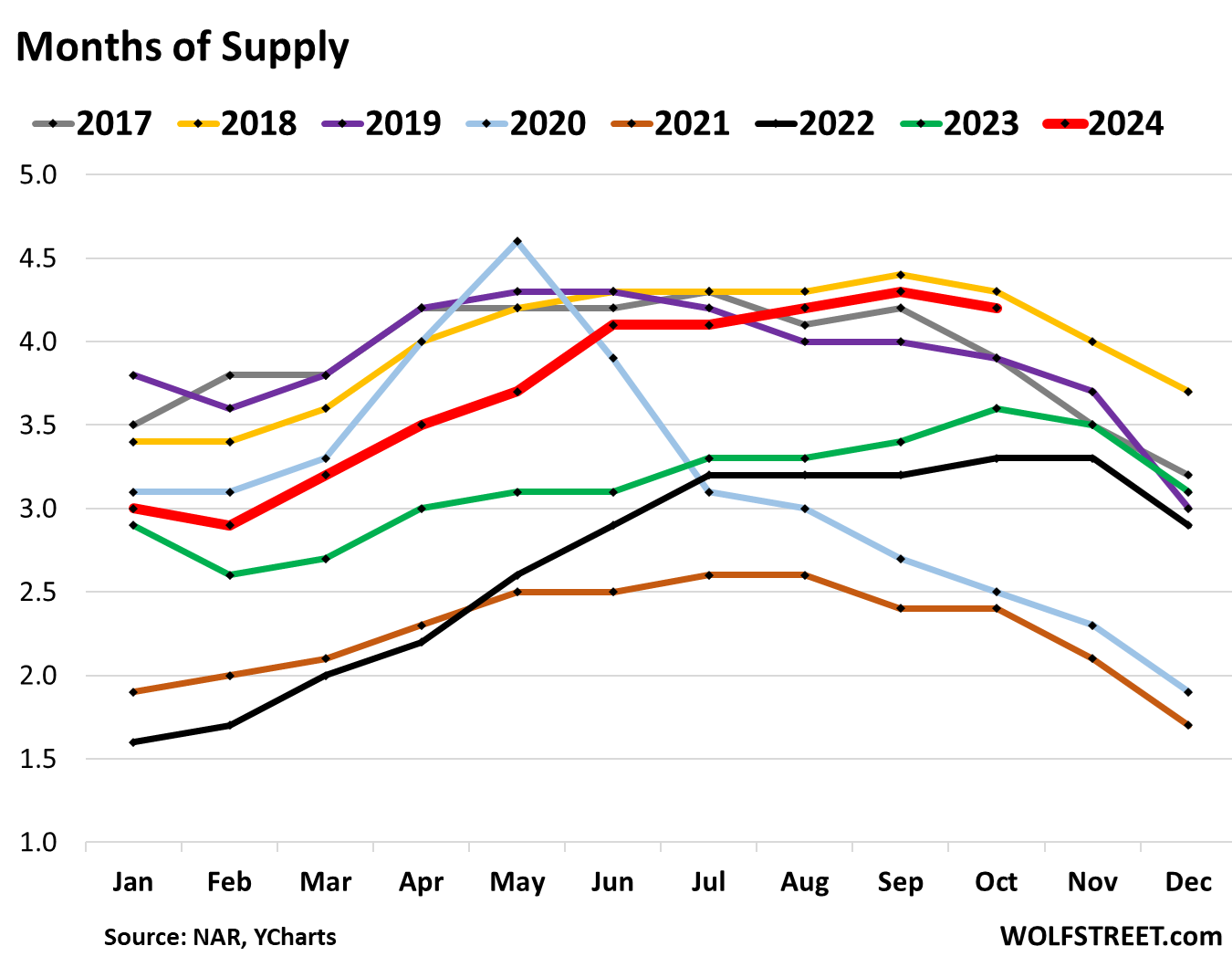 As demand has wilted this year and inventory has risen, supply in October at 4.2 months (red in the chart below) was the second highest for any October in the past 7 years, behind only October 2018 with 4.3 months (yellow):