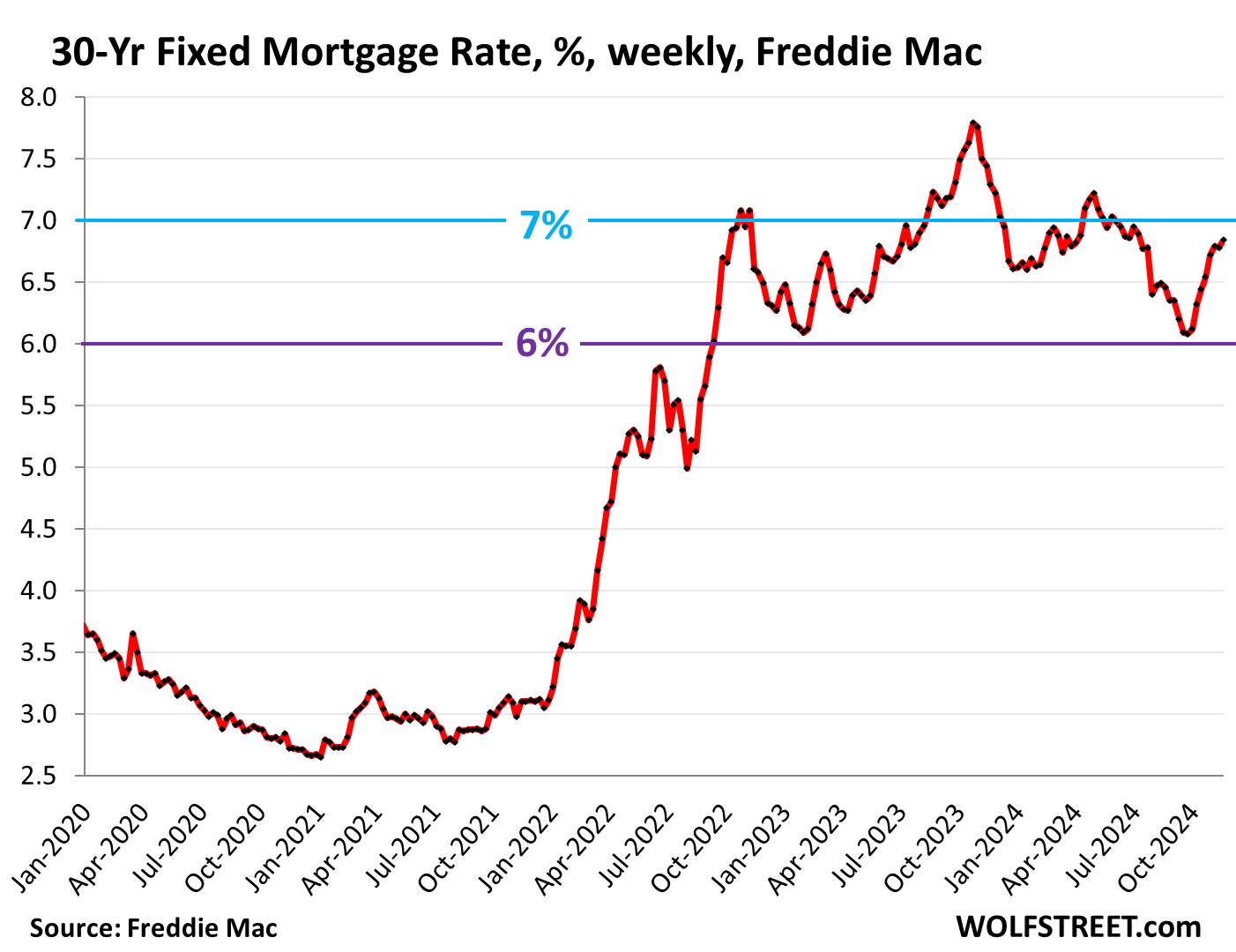 The average 30-year fixed mortgage rate rose to 6.84%, according to Freddie Mac’s weekly measure today.