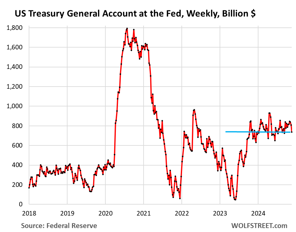 The periodic debt-ceiling charades in Congress lead to the TGA getting drained perilously close to zero. After the charade concludes, the government replenishes the TGA by borrowing huge amounts. But that hasn’t happened this year. Since about October 2023, the TGA has been roughly at the current level.