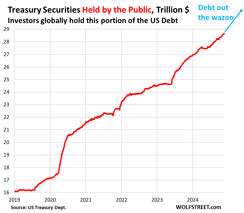 Of that $36.03 trillion in Treasury securities, $28.69 trillion are “held by the public” in accounts in the US and around the world, in brokerage accounts, by banks, by insurance companies, at financial centers, by central banks, by the Fed, etc., and these securities can be traded in the market.