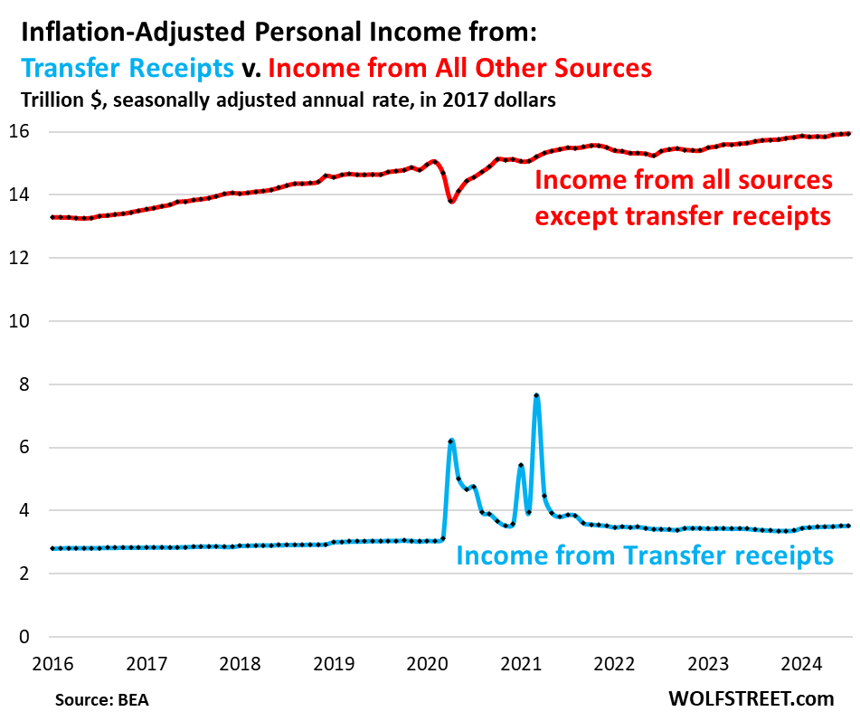 This chart shows inflation-adjusted income without transfer payments (red) and transfer payments, most of which are SS payments, see first paragraph (blue).